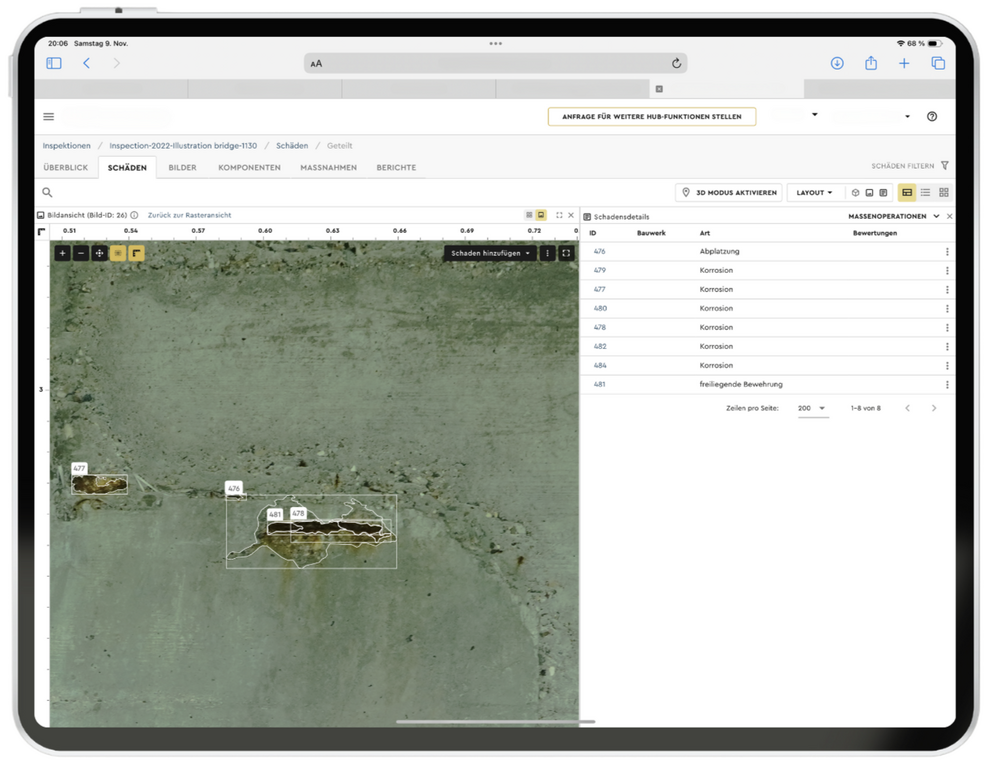 Wir erstellen mit unserer Software digitale Zwillinge von Ihren Bauwerken. Unsere Kamerasysteme sind in der Lage eine Ground sampling distance (GSD) von bis zu 0,5mm zu erfassen. Mit unserer 3D-Software bieten wir ein digitales Modell des Bauwerks, um die Schäden effizienter und genauer zuzuordnen.
